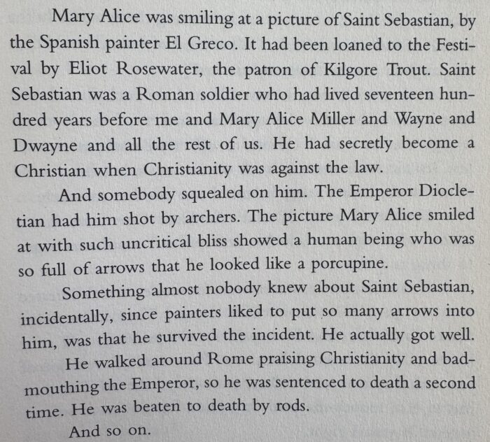 But here, in Breakfast of Champions, I found my answer. It was Saint Sebastian:
